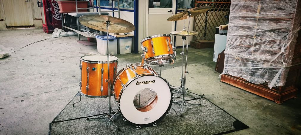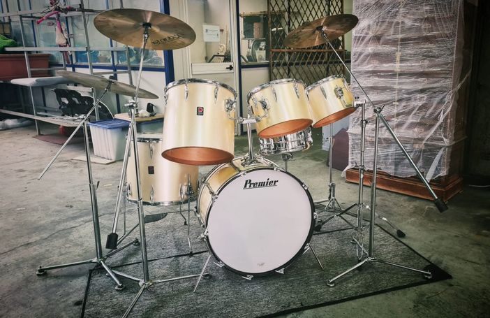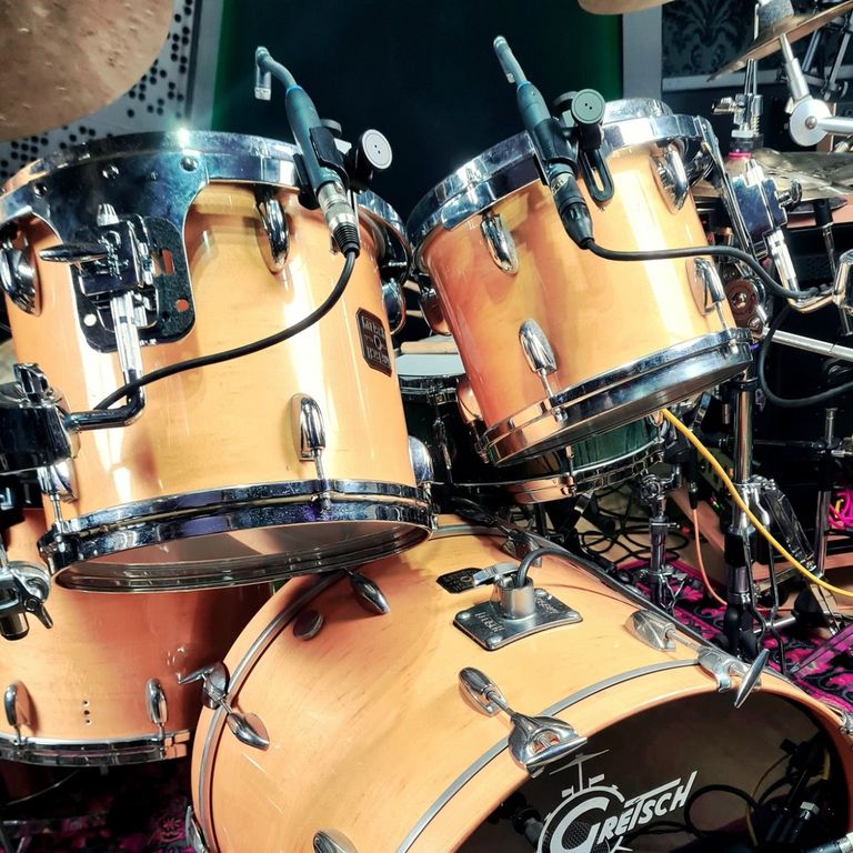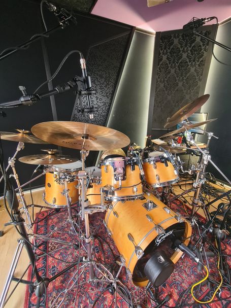 At my studio I often use both a Yamaha Hybrid Maple or a vintage 70's Gretsch blonde maple kit as 'house kit's, but I can chose among some other old but amazing drum sets from Ludwig, Slingerland and Premier.
